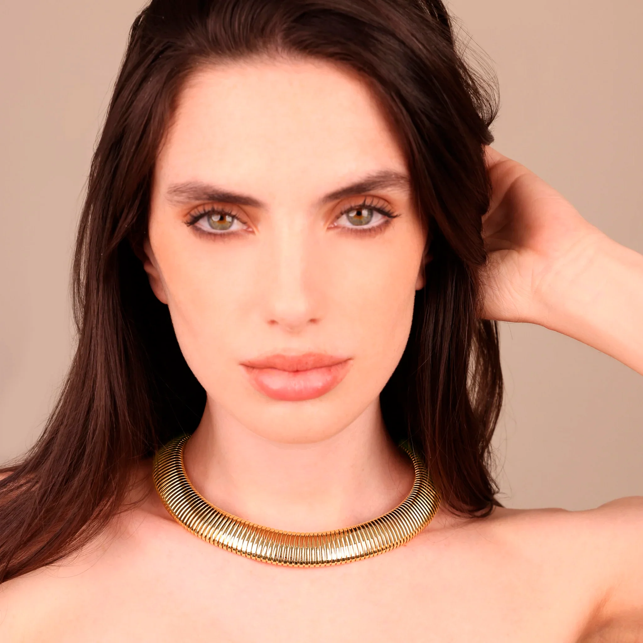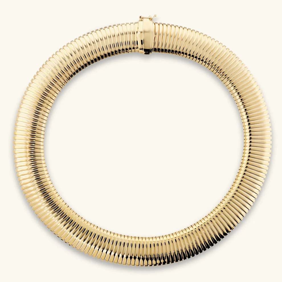 Collana girocollo Etrusca Gioielli realizzato in lega Golden, placcata Oro giallo 18kt, con maglia tubogas. Finitura lucida. Chiusura a cassetto con otto di sicurezza.