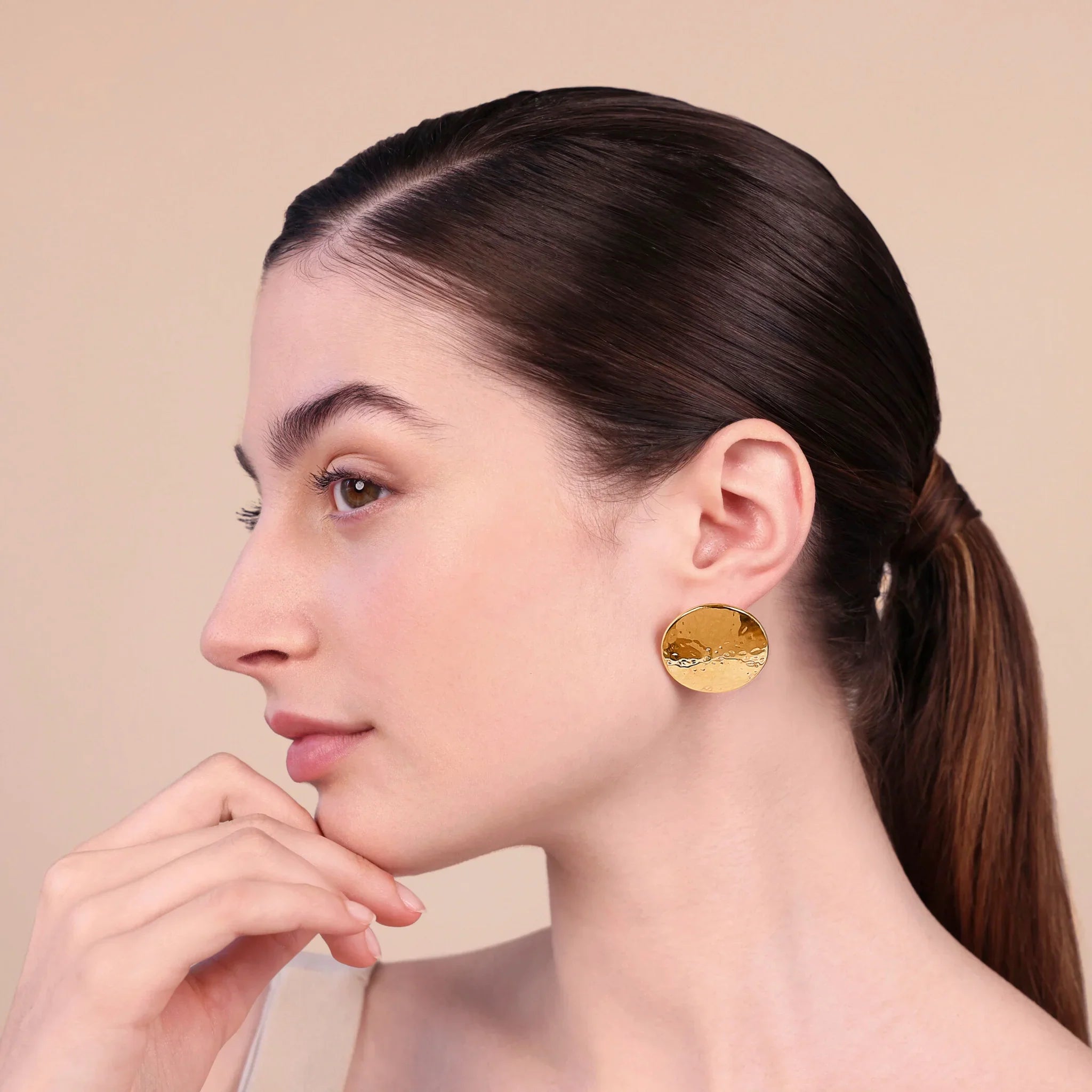 Orecchini a lobo Etrusca Gioielli realizzati in lega Golden, placcata Oro giallo 18kt, a forma di disco con superficie martellata. Chiusura a perno e farfalla.