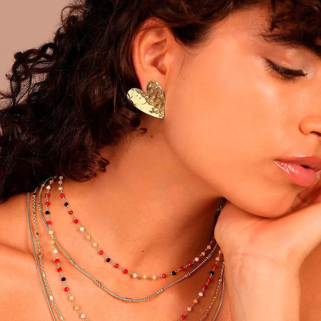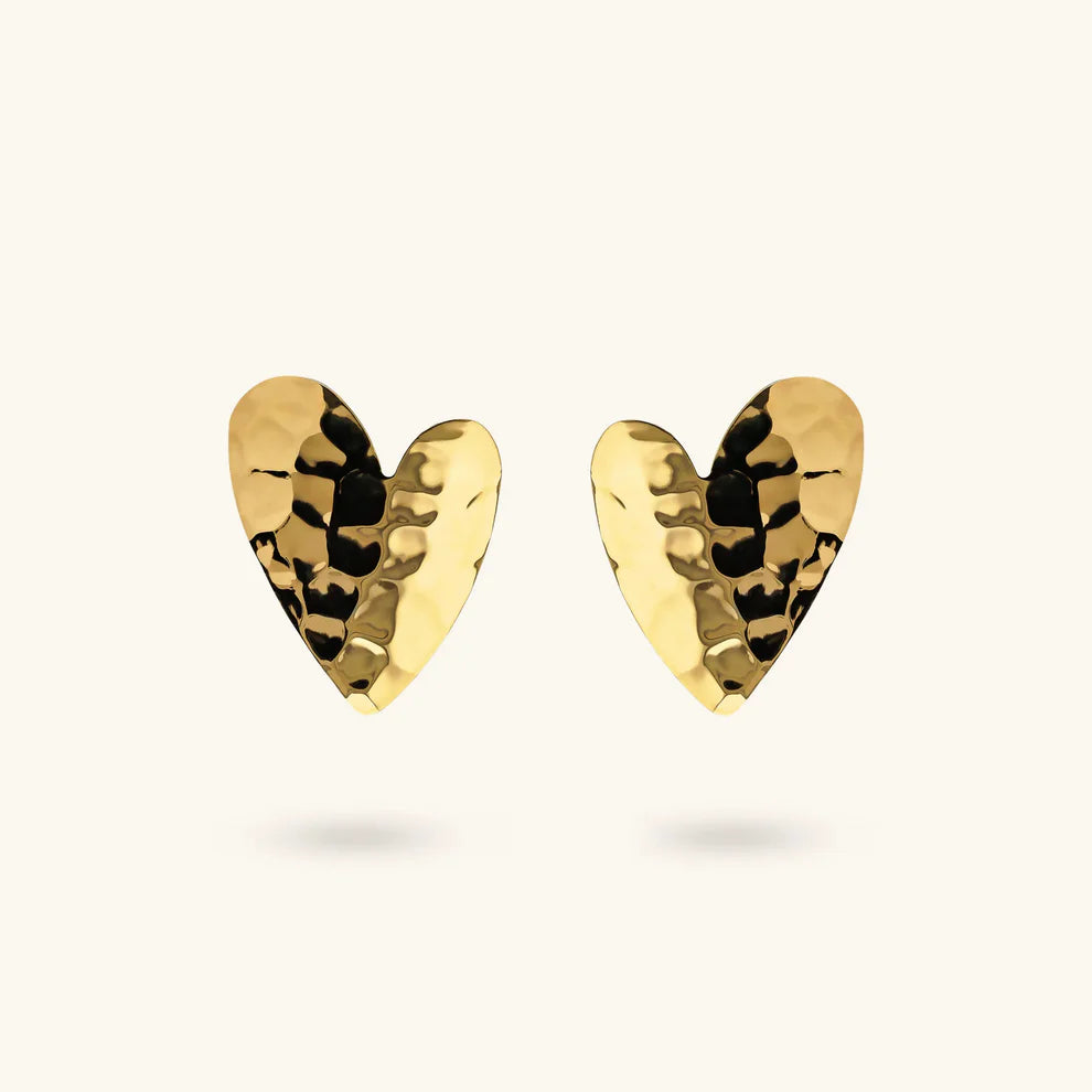 Orecchini a lobo Etrusca Gioielli realizzati in lega Golden, placcata Oro giallo 18kt, a forma di cuore (30x25 mm) con superficie martellata. Chiusura a perno e farfalla.