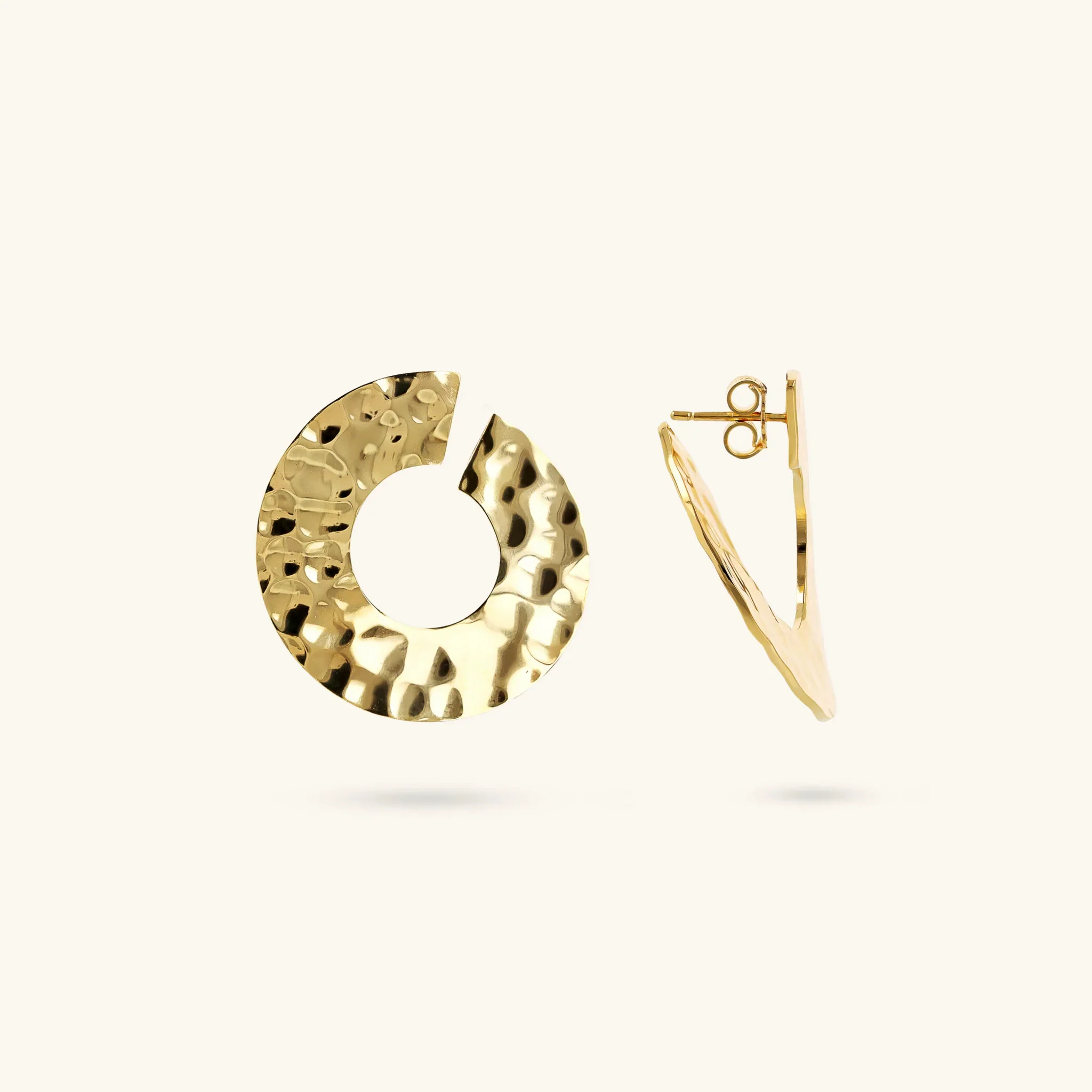 Orecchini pendenti ad anello realizzati in lega Golden, placcata Oro giallo 18kt o Rodio, dalla superficie martellata e design semi-aperto. Chiusura a perno e farfalla.