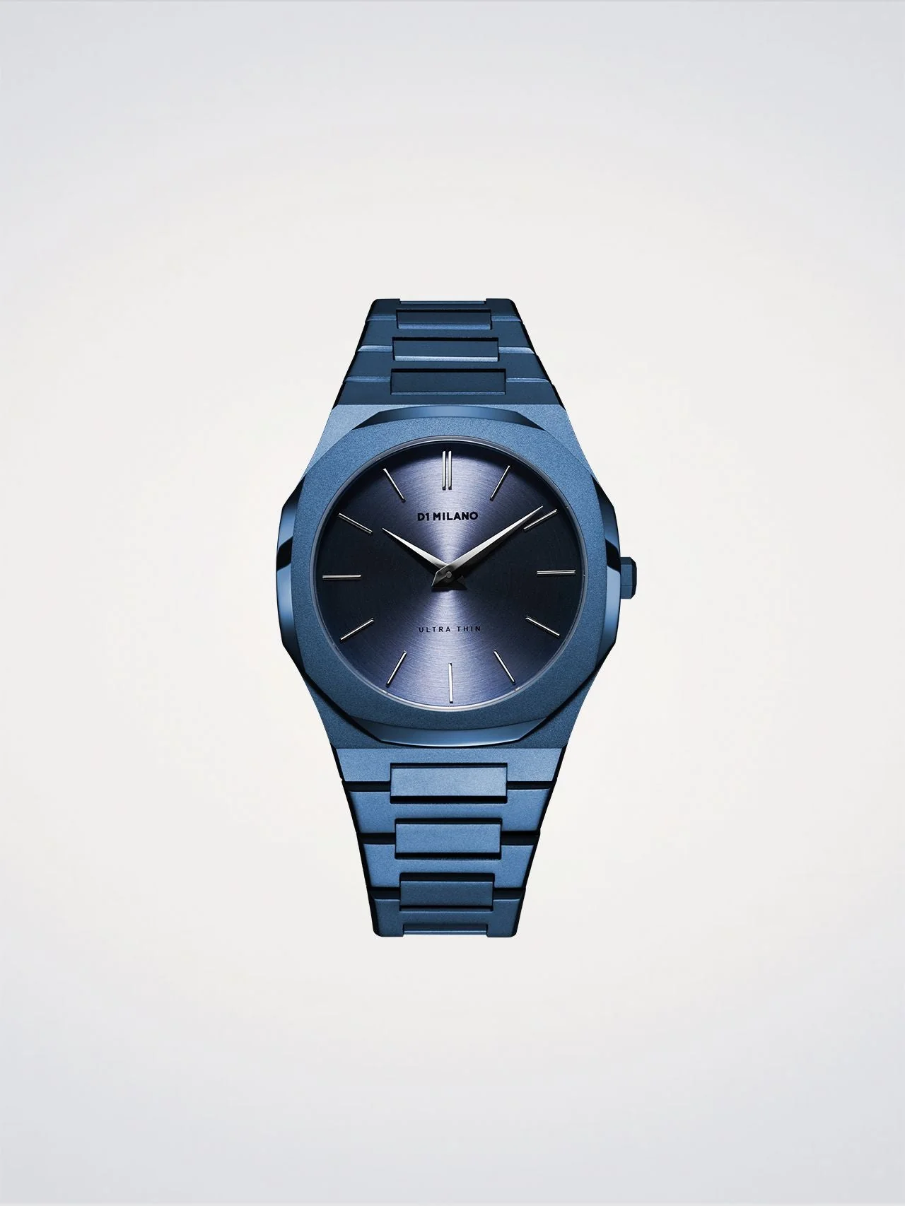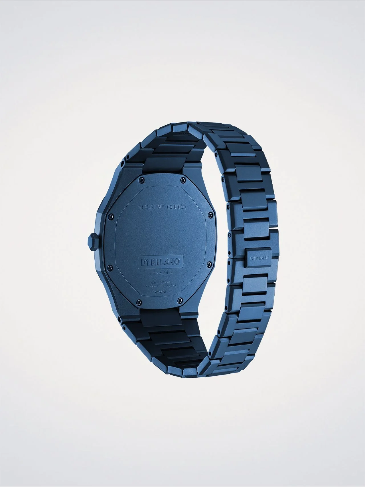 Icona monocromatica dal design audace, completamente sabbiata e placcata in blu. Il quadrante circolare spazzolato è rivestito nella stessa tonalità dell'orologio, ma con accenti di canna di fucile scuro su lancette e indici.